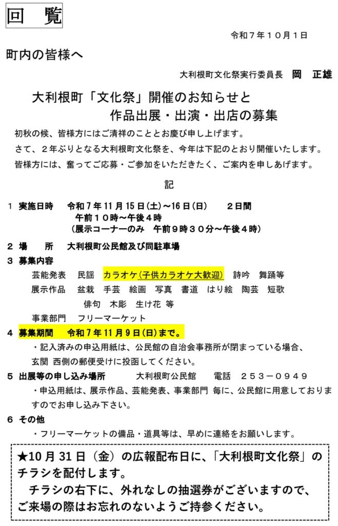 大利根町「文化祭」開催のお知らせと作品出展・出演・出店の募集を致します。