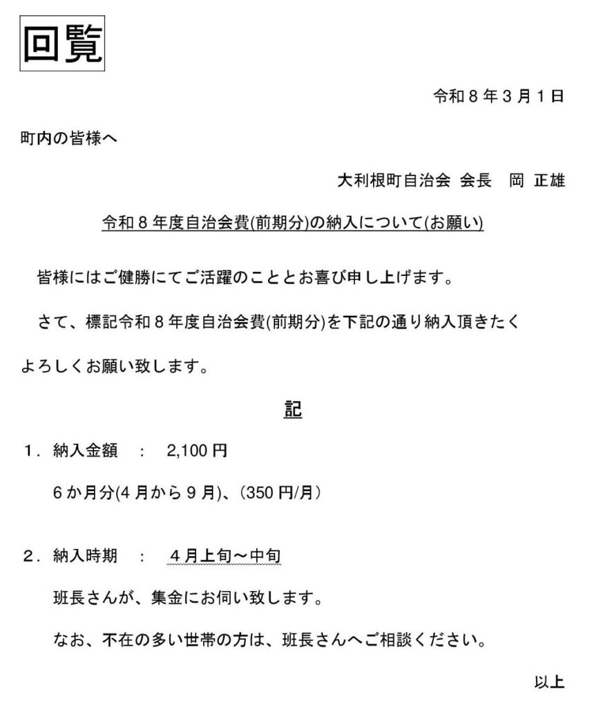 令和8年度 前期分の自治会費を4月(上旬から中旬)に集金予定です。
