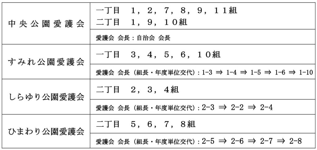 公園愛護会の分担は、下表の通りです。