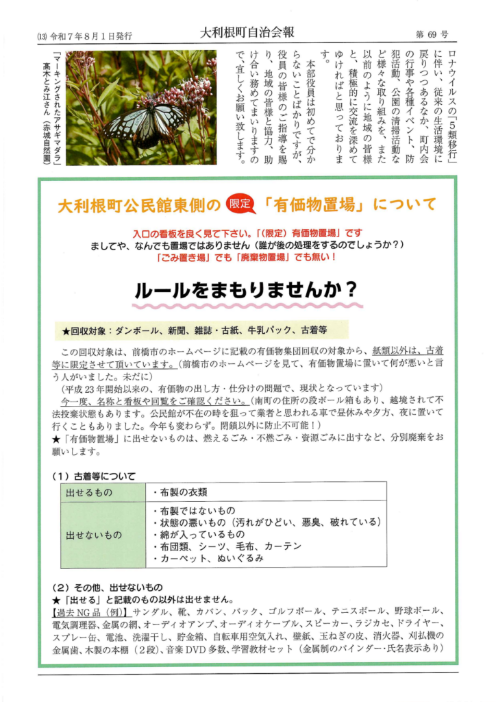 このまま、ルール違反(特に、危険性のあるもの)が続けば、業者が回収を拒否し、前橋市が認定する有価物集団回収の団体から大利根町が除外されることになり、有価物倉庫を閉鎖することになります。