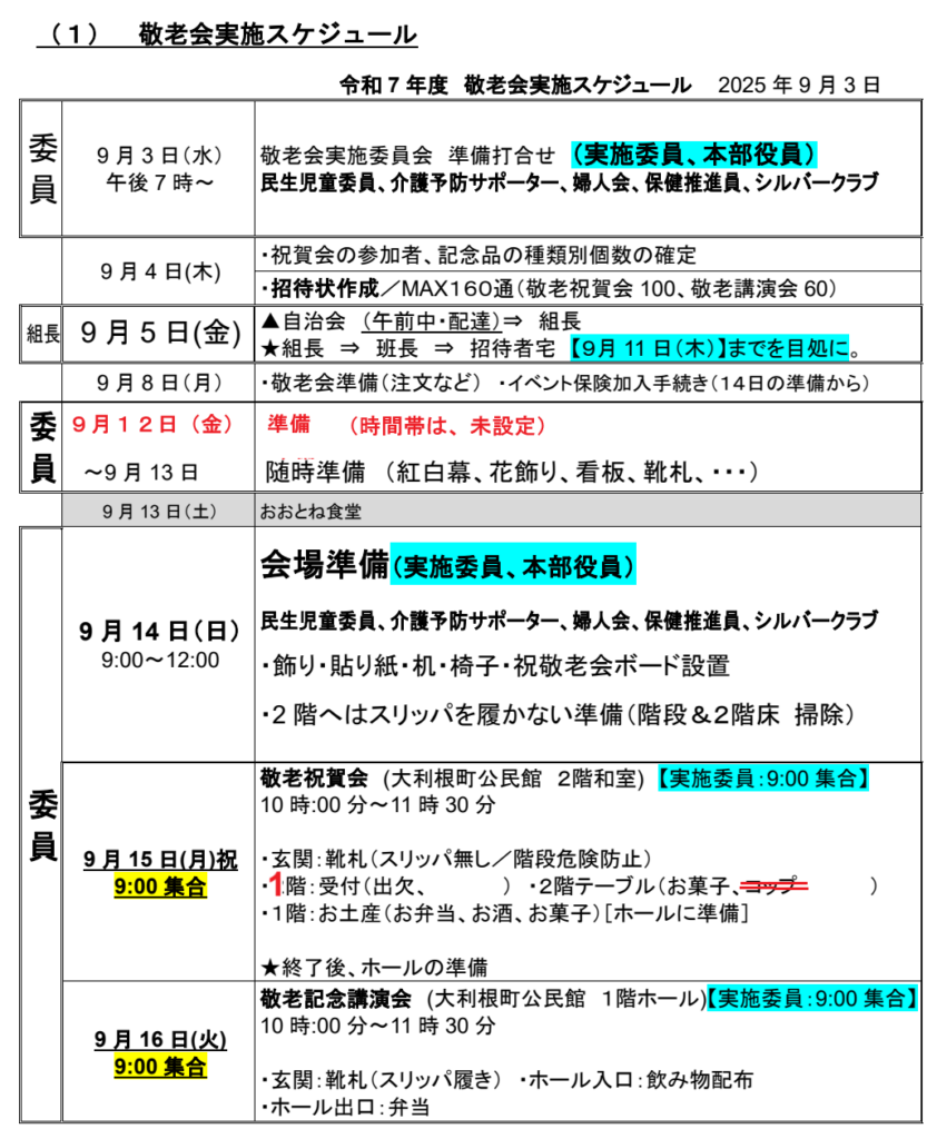 敬老会実施委員会議(9月3日[水]19:00~20:00)