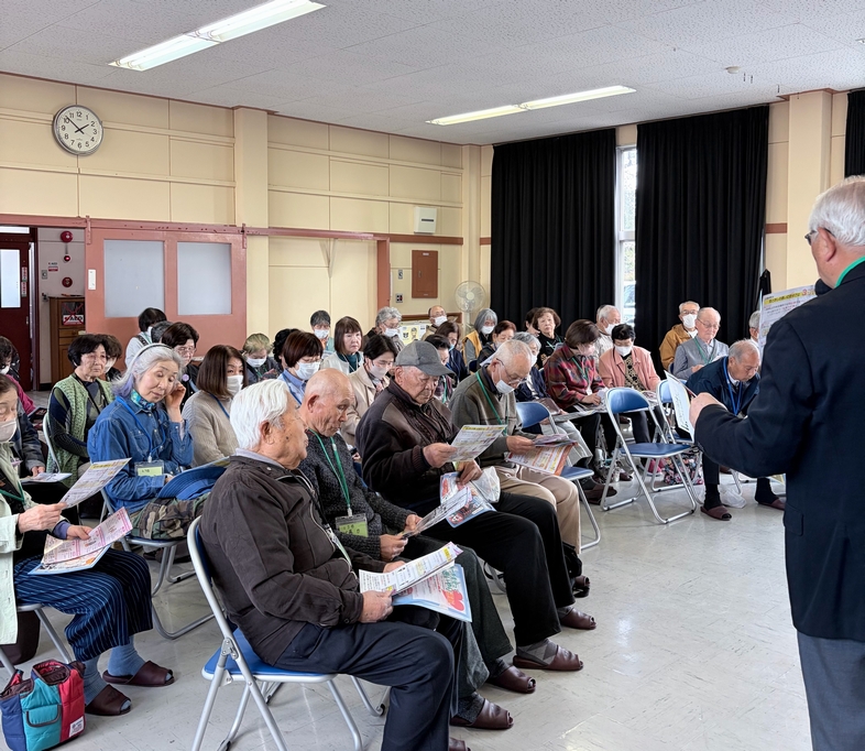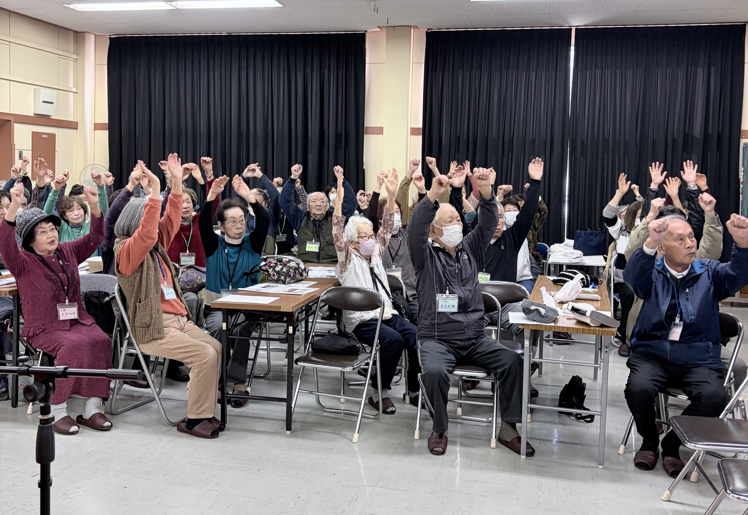 田口教授は骨折中にもかかわらず、拍手や指を使った脳トレ、各種ジャンケンゲームなどで会場を盛り上げてくださり、参加の皆さんは、楽しく大笑いしながらフレイル予防の方法を学びました。